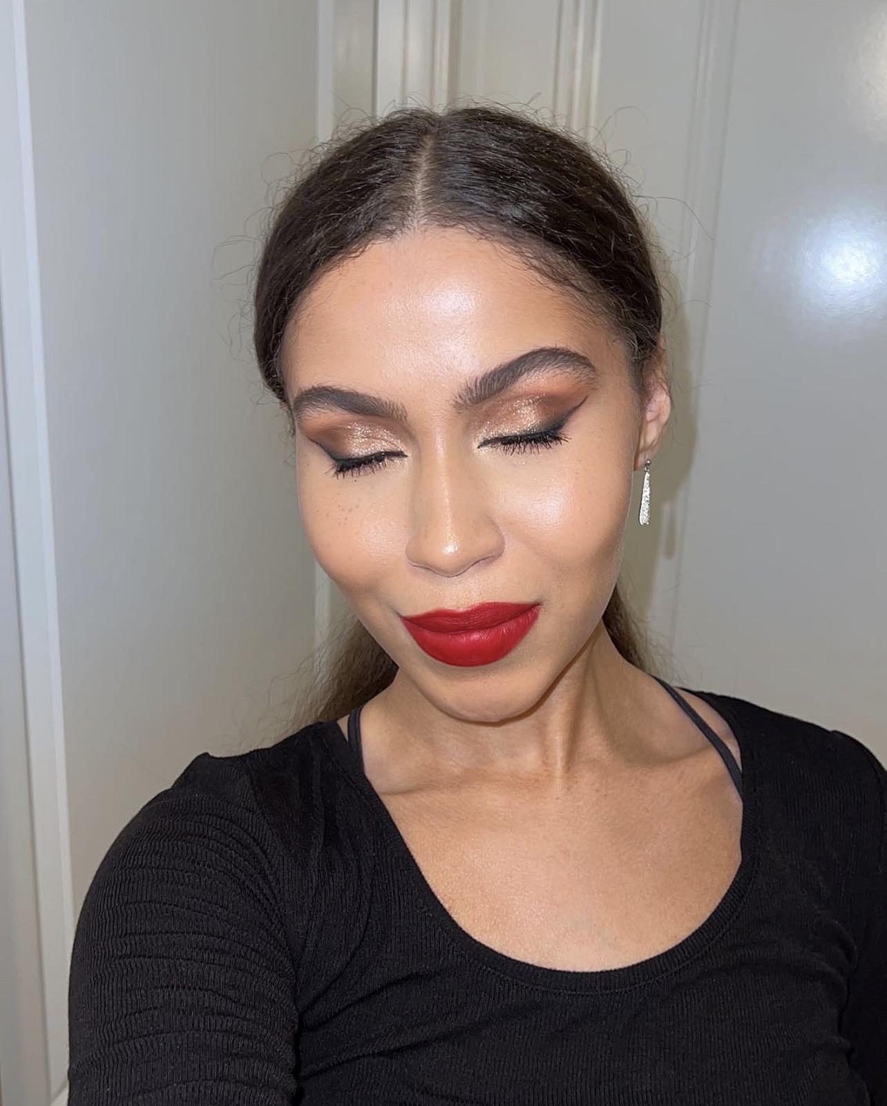 The eyes are still stripped back, for this look. But still packs a holiday punch. Neutral transitional shades in the crease, and a shimmering champagne eyeshadow so you’re looking all Christmas gift wrapped. And to finish the eyes, a thin black eyeliner, smoked out with a dark brown eyeshadow, just to soften the eyes, but add more mystery with a light smoked effect.